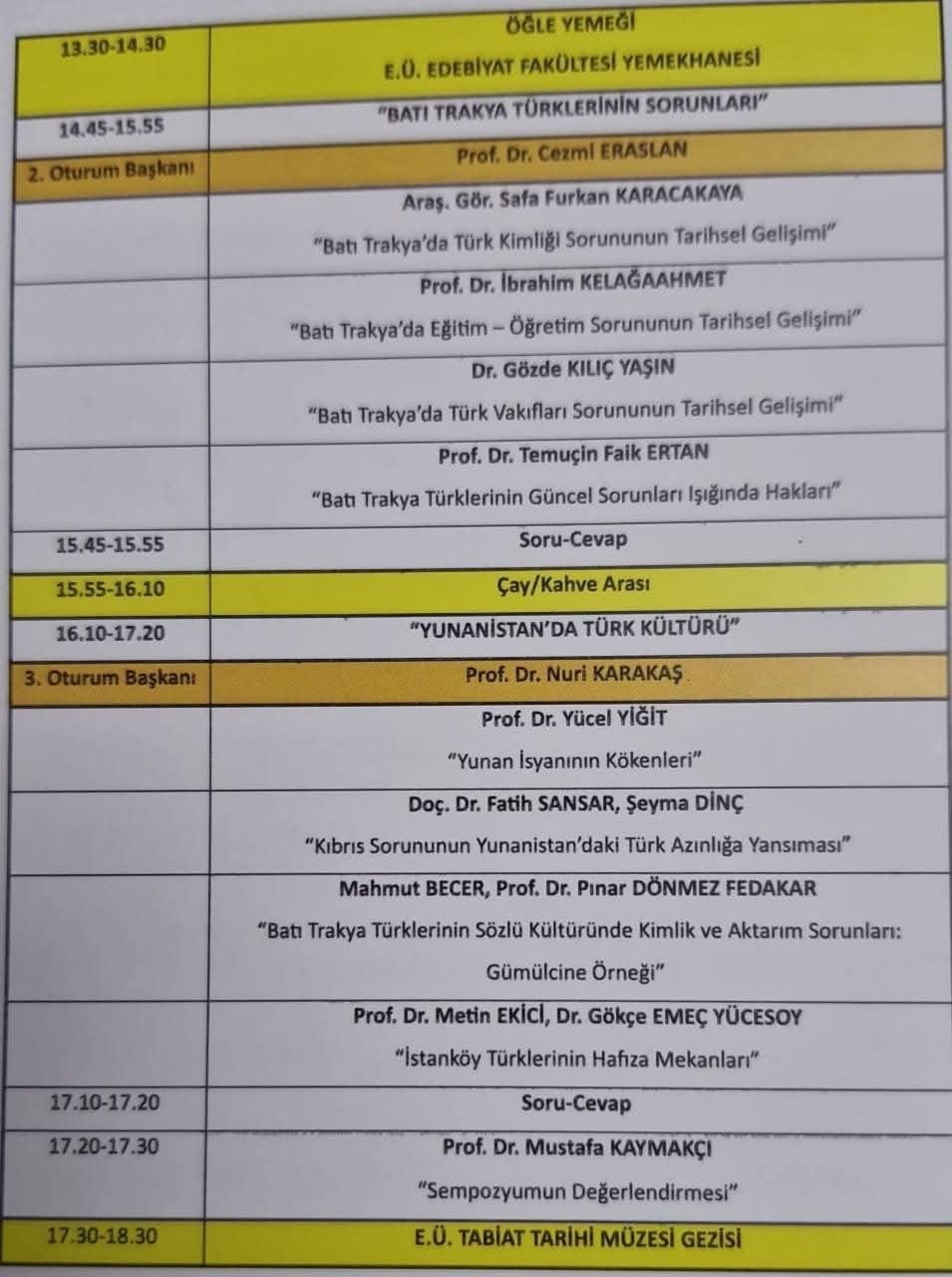 Açıklama şu şekilde; Rodos, İstanköy ve Onikiada Türkleri Kültür ve Dayanışma Derneği (ROİSDER), Batı Trakya Türkleri Dayanışma Derneği, E.Ü. Atatürk İlkeleri ve İnkılap Tarihi Uygulama ve Araştırma Merkezi ve Türkiye Cumhuriyeti Yurtdışı Türkler ve Akraba Topluluklar Başkanlığı’nın maddi ve manevi desteğiyle 19 Aralık 2025 günü Ege Üniversitesi Türk Dünyası Araştırmaları Enstitüsü Konferans Salonu’nda “Yunanistan’da Yaşamakta olan Türklerinin Sorunları Sempozyumu” düzenleyecektir. Sempozyum saat 9.50’da başlayacak ve saat 18.00’dde sona erecektir. Sempozyum programı; Yunanistan’da Yaşayan Türklere Genel Bir Bakış: Tarih, Kültür ve Güncel Sorunlar”adlı iki söyleşiden sonra “Rodos Ve İstanköy Türklerinin Sorunları”, “Batı Trakya Türklerinin Sorunları” ve “Yunanistan’da Türk Kültürü” olmak üzere üç panelden oluşacaktır. Sempozyum açış konuşmasında Rodos, İstanköy ve Onikiada Türkleri Kültür ve Dayanışma Derneği Başkanı ve sempozyum düzenleme kurulu başkanı Prof.Dr.Mustafa Kaymakçı şunlar dile getirecektir: Kaymakçı, Türk-Yunan İlişkilerindeki sorunların güncelliğini sürekli koruduğunu,bu sorunlar arasında Batı Trakya Türkleri ile İstanbul’daki Rumların sorunları yanı sıra Kıbrıs Sorunu,Ege Denizi jeopolitiği açısından kaynaklanan konular ve de Onikiadalarda yaşamakta olan kadim Türklerin Türk kimliğini koruma konularını dile getirmiştir. Kaymakçı sözlerine şöyle devam etmiştir: “ Yunanistan’da Yaşamakta olan Türklerin eğitimden, imara, kültürel haklardan, kimlik sorununa, ekonomiden siyasal haklara varıncaya kadar birçok sorunu vardır. Ancak en önemlisi, yıllardan bu yana uygulanan asimilasyon,ancak bana göre biir kültürel soykırım politikasıdır. Bu bağlamda Yunanistan'da Türk kelimesi yasaklanmıştır.Resmi Yunan politikasına göre “Türk” azınlıktan “Müslüman” diye söz ediliyor Yunanlar, Türklere karşı kültürel maddi ve manevi değerleri yok etmeye yönelik bir kültürel soykırım uygulamaktadır. Türkiye ile Yunanistan arasında,dönemsel çıkar çatışmalarının dışında varolan çelişkinin, iki temel nedenden kaynaklandığı söylenebilir. Bunlardan birincisi;Yunan kamuoyunda Türklere karşı “kalıp yargılar:stereotip”’ın değişmezliğidir. İkincisi ise;Çağdaş Yunan tarihinin Türklere karşı vermiş oldukları bağımsızlık savaşı sonunda inşa edilmiş olmasıdır.Bu bağlamda günümüzde bile Batı dünyasının beslemekte olduğu çıkar çatışmasıyla Yunanistan, Türkleri/Türkiye Cumhuriyeti’nin kendilerine tehdit olarak görmektedir. Kaymakçı sözlerine şöyle sonuçlandırmıştır: Yunan algısındaki Türk imgesinin sorunlu yapısı ve olumsuz yaklaşımların her iki ülke ve halklarına yarar getirmediği açıktır. Bu nedenle Türk-Yunan ilişkilerinde rekabet yerine işbirliği, çatışma yerine uzlaşı ruhunun egemen olması bir zorunluluktur. Türkiye ile Yunanistan arasındaki ilişkilerin karşılıklı yarar temelinde daha da gelişmesi, salt iki ülke ve halkları için değil, bütün bölgenin refah ve istikrarı bakımından önemlidir.Dostluğun inşa edilmesinde öncelikle her iki halkın entelektüeline(aydınlarına )büyük görevler düştüğü açıktır. Her iki halkın aydınlarının kuracağı dostluk köprüsü,iki devlet arasındaki gerginliğin sıkıntısını çekmiş ve çekmekte olan toplumların,daha doğrusu azınlıkların bir yandan kendi kültürlerini koruması ve geliştirmesine, bir yandan da silahlara ayırmak zorunda bırakıldıkları kaynakları ülkelerinin bayındırlık işlerine ayırmasına hizmet edebilir.”