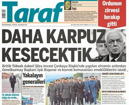Bergama'lı köylülerin direnişlerine aldırış etmiyorlar, mahkeme kararlarını tanımıyorlardı... Altın uğruna doğanın katledilişine kılıf üstüne kılıflar uydurup halkın sağlığını, doğal hayatı yok etmede bir sakınca görmüyorlardı. O zamanlar ortaktılar. Sarmaş dolaştılar. Ne istiyorsalar alıyorlardı. Milyar dolarlarla ölçülen karanlık servet biriktikçe daha da azıyorlardı. Koza-İpek Holding küçük bir matbaa iken davetiye basıyordu. Nereden geldi bu servet? Kimlerin birikimi? Neyin karşılığı böylesine akıl almaz büyüme? Unutmayın !!! Vatanını satanların sonları hiç bir zaman iyi bitmez. Bu insanlık tarihi boyunca böyledir. Toprak ihaneti asla kabullenmez. ![]() ![]() Ve kademe kademe ilerleyip sonunda TSK ya sıra gelmişti. Aydınlara, gazetecilere... Unuttunuz mu? Aşağıda ki manşetleri kimler atıyordu? ![]() Tutuklanan Nedim Şener'lerin arkasından yazdıklarının daha mürekkebi kurumadı. Şimdi kalkmış utanmazca "Basın Özgürlüğü" diyorlar. Oysa bu hukuksuzluğun temelini ortakları ile birlikte atmışlardı. ![]() Eli kanlı katilleri getirip Türkiye'nin en aydın isimleri ile birlikte dava konusu yaptılar. Türkan Saylan Danıştay Katili ile birlikte suç ortağı edilmişti... Kimdi bu kumpasları kuran? Nere de, hangi merkez de hazırlanıyordu bu kumpaslar? İnleri neredeydi? Ortakları bunu çok iyi biliyordur. Unutmayın kimse yaptığı haksızlıkların üstüne yatamaz. Hakikat güçlüdür. Komutanların onurlu davranışları ile alay ediyorlardı unutmayın. Daha karpuz kesecekler miş... ![]() Bunlar şimdi "Özgür Basın" a sığınacaklar... Bizde tüm olanları unutacağız... Hayır... Buna inanacak saflar belki çıkabilir ancak yurtseverler, devrimciler ve tarih bunları unutmaz. Davalar sonlanmadan inlerinde davaları sonlandırıp kararları yazıyorlar dı? Unutmayın, unutturmayın... ![]() Haber Kaynağı: ESH- Doğan Prepol