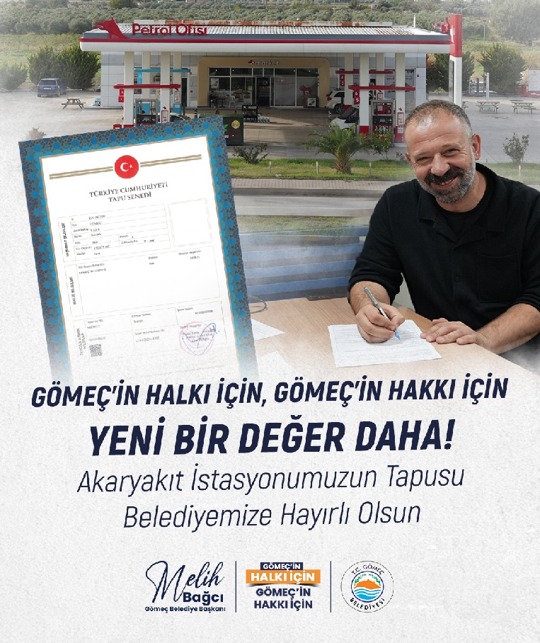 GÖMEÇ BELEDİYESİ’NE YENİ BİR MÜLK KAZANDIRILDIGömeç Belediyesi, ilçeye değer katacak önemli bir yatırımı daha hayata geçirdi. Belediyenin yürüttüğü çalışmalar sonucunda, Gömeç sınırları içerisinde yer alan akaryakıt istasyonunun tapusu resmen Gömeç Belediyesi mülkiyetine geçti.
