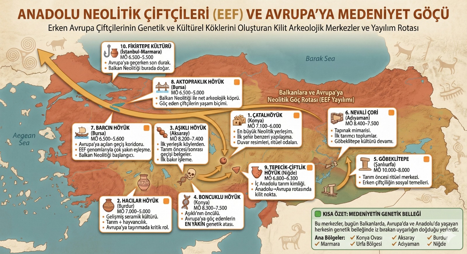 Bu dönem, Balkan insanının en eski ve en yerli tabanını oluşturuyor. Neolitik Devrim: Anadolu’dan Gelen Büyük Dönüşüm Yaklaşık MÖ 7.000–5.000 arasında, dünya tarihinin en önemli göçlerinden biri yaşandı. Anadolu Neolitik Çiftçileri (EEF) Avrupa’ya geçti. Tarımı, hayvancılığı, kalıcı yerleşimi ve medeniyetin ilk adımlarını taşıyan bu insanlar, Balkan gen havuzunu baştan aşağı dönüştürdü. Bu dönemde oranlar şöyleydi: