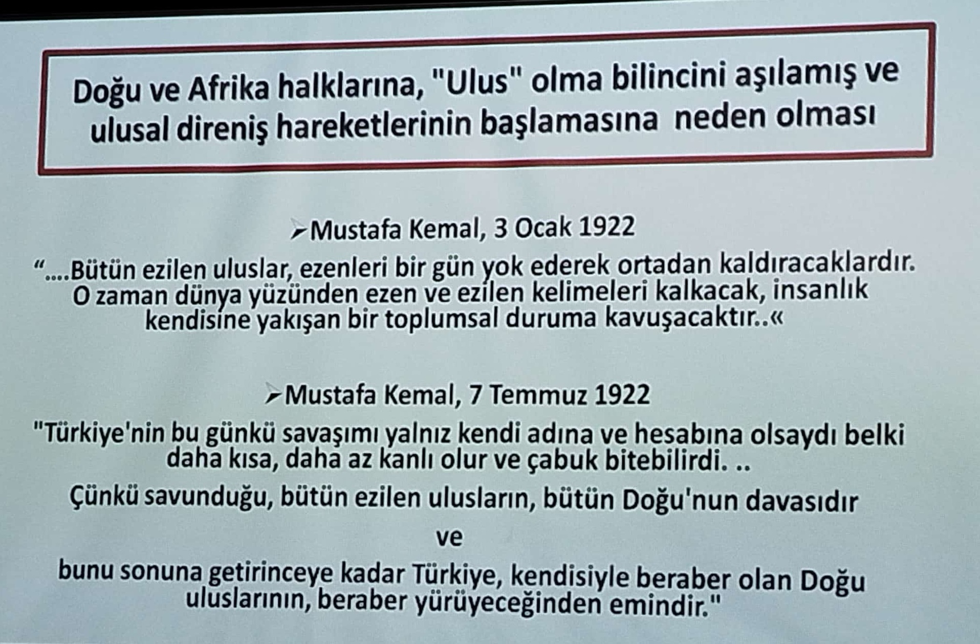 Kalabalık bir dinleyici kitlesinin katıldığı toplantıda, Kaymakçı söyleşisinin başında “Batı emperyalizmi tarafından sömürülmüş/sömürülmekte olan Asya ve Afrika Halkları, Atatürk’ün Batı emperyalizmine karşı kazanmış olduğu siyasi ve sosyal zaferler ile kurulmuş olan Cumhuriyetini kendilerine örnek almışlardır”. dedi