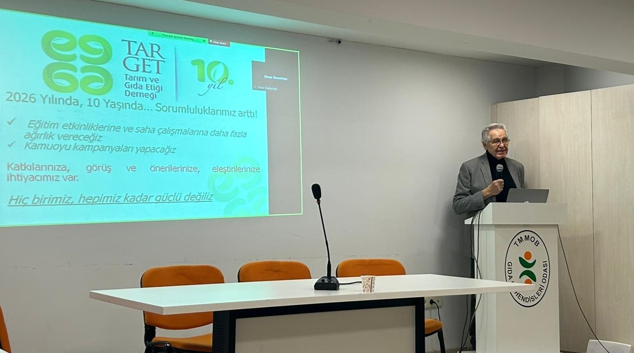 TARGET Üye Danışma Toplantısı YapıldıTarım ve Gıda Etiği Derneği (TARGET) 2026 yılı Üye Danışma Toplantısı, TMMOB Gıda Mühendisleri Odası Eğitim Salonunda gerçekleşti. Aynı zamanda çevrimiçi katılımların olduğu toplantıda Derneğin geçen yıl gerçekleştirdiği faaliyetler hakkında bilgi verildi ve gelecekte yapılabilecekler üzerinde değerlendirmeler yapıldı.