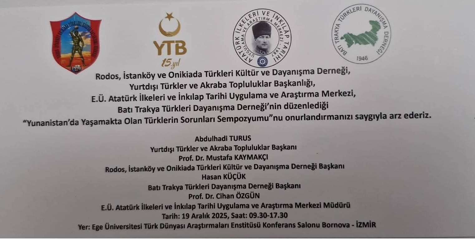 Yunanistan’daki Türklerin Sorunları İzmir’de Masaya YatırılacakRodos, İstanköy ve Onikiada Türkleri Kültür ve Dayanışma Derneği(ROİSDER), Batı Trakya Türkleri Dayanışma Derneği, E.Ü. Atatürk İlkeleri ve İnkılap Tarihi Uygulama ve Araştırma Merkezi ve Türkiye Cumhuriyeti Yurtdışı Türkler ve Akraba Topluluklar Başkanlığı’nın maddi ve manevi desteğiyle 19 Aralık 2025 günü Ege Üniversitesi Türk Dünyası Araştırmaları Enstitüsü Konferans Salonu’nda “Yunanistan’da Yaşamakta olan Türklerinin Sorunları Sempozyumu” düzenleyecek.