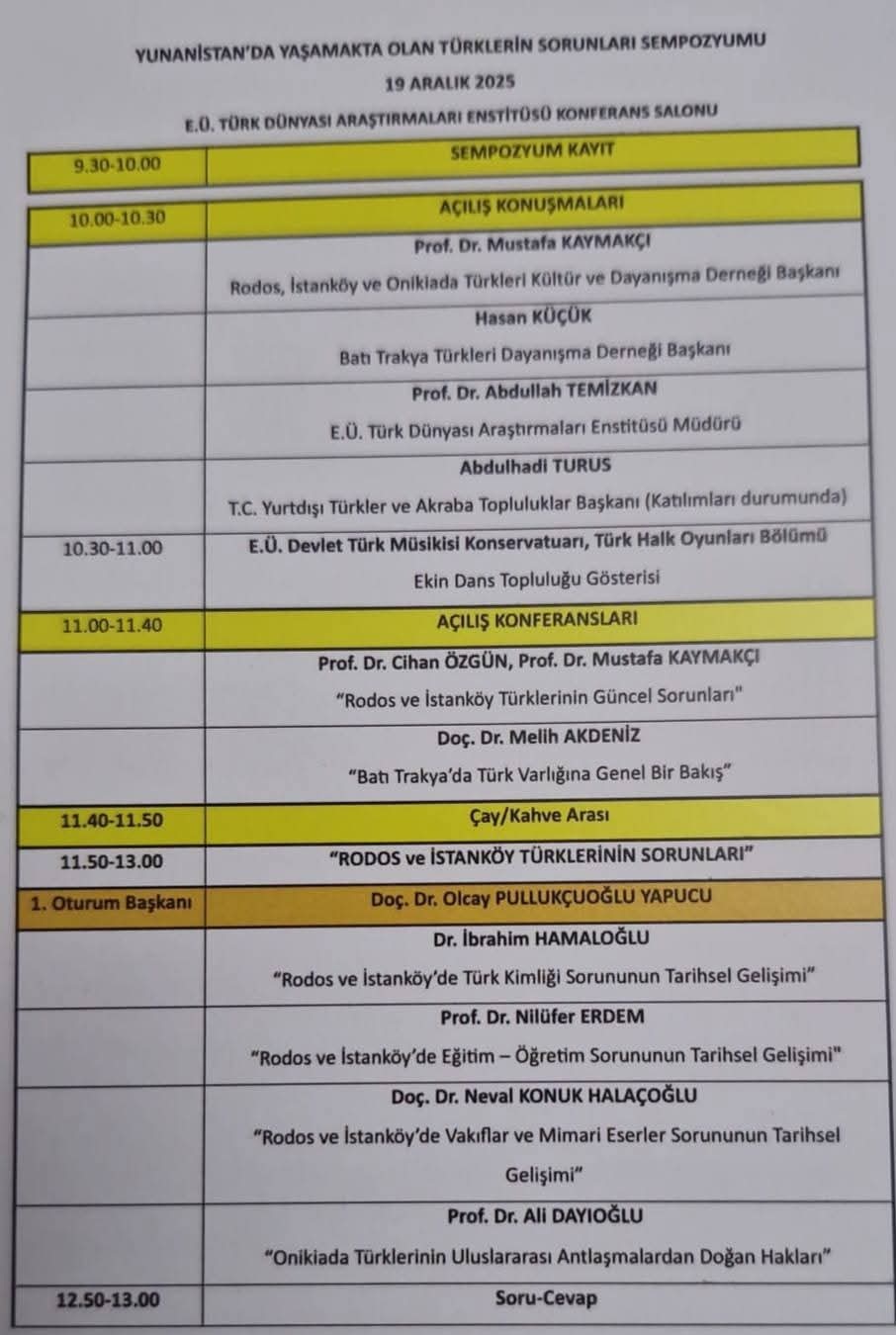 Açıklama şu şekilde; Rodos, İstanköy ve Onikiada Türkleri Kültür ve Dayanışma Derneği (ROİSDER), Batı Trakya Türkleri Dayanışma Derneği, E.Ü. Atatürk İlkeleri ve İnkılap Tarihi Uygulama ve Araştırma Merkezi ve Türkiye Cumhuriyeti Yurtdışı Türkler ve Akraba Topluluklar Başkanlığı’nın maddi ve manevi desteğiyle 19 Aralık 2025 günü Ege Üniversitesi Türk Dünyası Araştırmaları Enstitüsü Konferans Salonu’nda “Yunanistan’da Yaşamakta olan Türklerinin Sorunları Sempozyumu” düzenleyecektir. Sempozyum saat 9.50’da başlayacak ve saat 18.00’dde sona erecektir. Sempozyum programı; Yunanistan’da Yaşayan Türklere Genel Bir Bakış: Tarih, Kültür ve Güncel Sorunlar”adlı iki söyleşiden sonra “Rodos Ve İstanköy Türklerinin Sorunları”, “Batı Trakya Türklerinin Sorunları” ve “Yunanistan’da Türk Kültürü” olmak üzere üç panelden oluşacaktır. Sempozyum açış konuşmasında Rodos, İstanköy ve Onikiada Türkleri Kültür ve Dayanışma Derneği Başkanı ve sempozyum düzenleme kurulu başkanı Prof.Dr.Mustafa Kaymakçı şunlar dile getirecektir: Kaymakçı, Türk-Yunan İlişkilerindeki sorunların güncelliğini sürekli koruduğunu,bu sorunlar arasında Batı Trakya Türkleri ile İstanbul’daki Rumların sorunları yanı sıra Kıbrıs Sorunu,Ege Denizi jeopolitiği açısından kaynaklanan konular ve de Onikiadalarda yaşamakta olan kadim Türklerin Türk kimliğini koruma konularını dile getirmiştir. Kaymakçı sözlerine şöyle devam etmiştir: “ Yunanistan’da Yaşamakta olan Türklerin eğitimden, imara, kültürel haklardan, kimlik sorununa, ekonomiden siyasal haklara varıncaya kadar birçok sorunu vardır. Ancak en önemlisi, yıllardan bu yana uygulanan asimilasyon,ancak bana göre biir kültürel soykırım politikasıdır. Bu bağlamda Yunanistan'da Türk kelimesi yasaklanmıştır.Resmi Yunan politikasına göre “Türk” azınlıktan “Müslüman” diye söz ediliyor Yunanlar, Türklere karşı kültürel maddi ve manevi değerleri yok etmeye yönelik bir kültürel soykırım uygulamaktadır. Türkiye ile Yunanistan arasında,dönemsel çıkar çatışmalarının dışında varolan çelişkinin, iki temel nedenden kaynaklandığı söylenebilir. Bunlardan birincisi;Yunan kamuoyunda Türklere karşı “kalıp yargılar:stereotip”’ın değişmezliğidir. İkincisi ise;Çağdaş Yunan tarihinin Türklere karşı vermiş oldukları bağımsızlık savaşı sonunda inşa edilmiş olmasıdır.Bu bağlamda günümüzde bile Batı dünyasının beslemekte olduğu çıkar çatışmasıyla Yunanistan, Türkleri/Türkiye Cumhuriyeti’nin kendilerine tehdit olarak görmektedir. Kaymakçı sözlerine şöyle sonuçlandırmıştır: Yunan algısındaki Türk imgesinin sorunlu yapısı ve olumsuz yaklaşımların her iki ülke ve halklarına yarar getirmediği açıktır. Bu nedenle Türk-Yunan ilişkilerinde rekabet yerine işbirliği, çatışma yerine uzlaşı ruhunun egemen olması bir zorunluluktur. Türkiye ile Yunanistan arasındaki ilişkilerin karşılıklı yarar temelinde daha da gelişmesi, salt iki ülke ve halkları için değil, bütün bölgenin refah ve istikrarı bakımından önemlidir.Dostluğun inşa edilmesinde öncelikle her iki halkın entelektüeline(aydınlarına )büyük görevler düştüğü açıktır. Her iki halkın aydınlarının kuracağı dostluk köprüsü,iki devlet arasındaki gerginliğin sıkıntısını çekmiş ve çekmekte olan toplumların,daha doğrusu azınlıkların bir yandan kendi kültürlerini koruması ve geliştirmesine, bir yandan da silahlara ayırmak zorunda bırakıldıkları kaynakları ülkelerinin bayındırlık işlerine ayırmasına hizmet edebilir.”