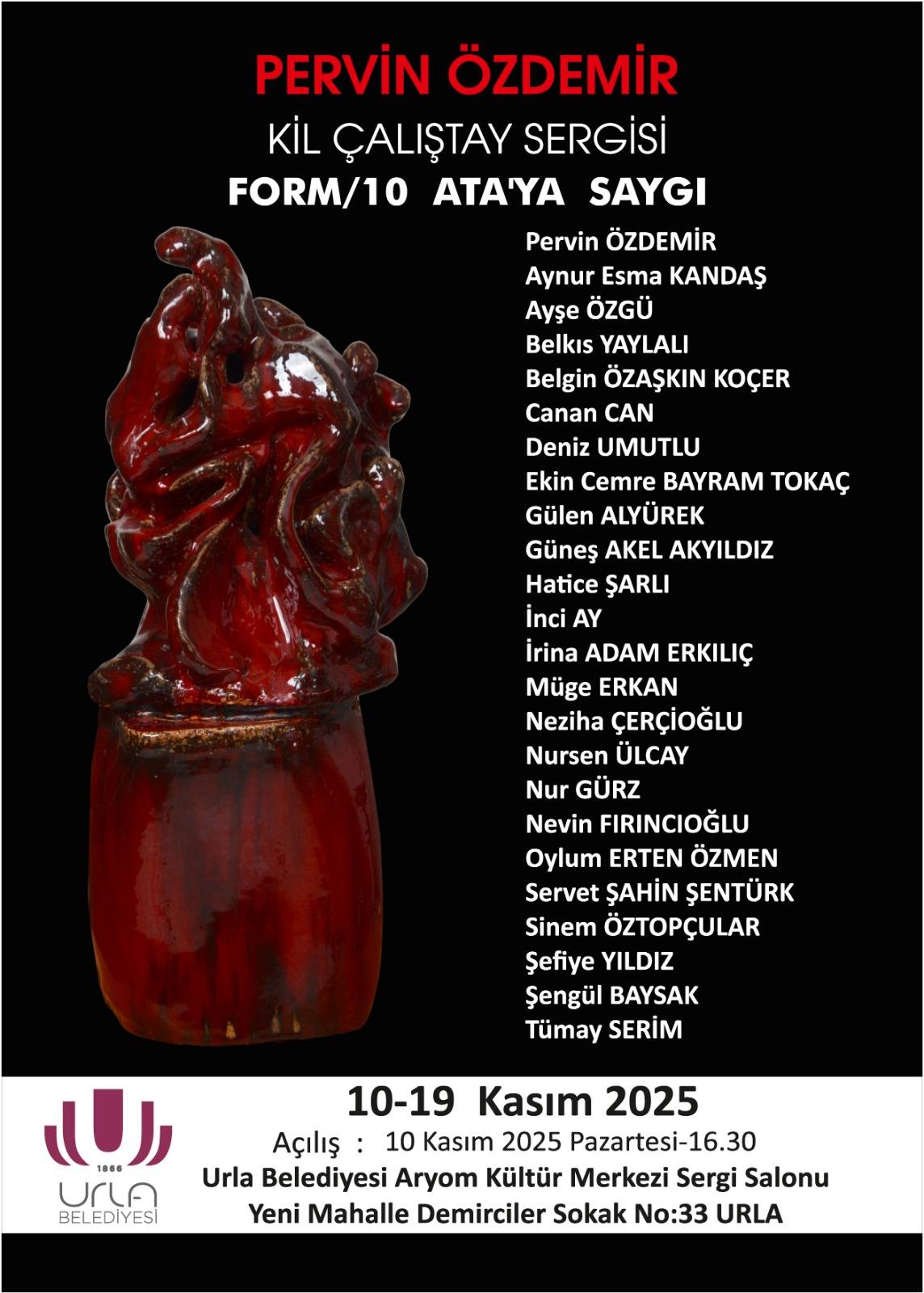 Uluslararası seramik sanatçısı Pervin Özdemir'den Atatürk’e vefa sergisi “Form 10/ATA’YA SAYGI” sanatseverlerle buluştuUluslararası seramik sanatçısı Pervin Özdemir öncülüğünde düzenlenen “Form10/ATA’YA SAYGI” sergisi, Urla Belediyesi Aryom Kültür Merkezi’nde sanatseverlerle buluştu. Sergide, 22 sanatçının Atatürk’e duyduğu sevgi ve saygıyı yansıtan özgün seramik eserleri yer alıyor.