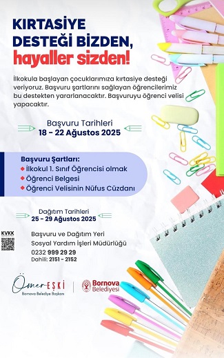 Kırtasiye desteği Bornova Belediyesi’nden hayaller çocuklarımızdan!Bornova Belediyesi, ilkokula yeni başlayan öğrencilere kırtasiye desteği verecek. 18 Ağustos’ta başlayan başvurular 22 Ağustos son bulacak. Dağıtımlar ise 25-29 Ağustos tarihleri arasında yapılacak. Başkan Ömer Eşki, “Eğitimde fırsat eşitliği için çocuklarımızın yanında olmayı sürdüreceğiz” dedi.![]() Bornova Belediyesi, bu yıl da ilkokula yeni başlayan minik öğrencilere kırtasiye desteği verecek. “Kırtasiye desteği bizden, hayaller sizden” sloganıyla duyurulan uygulama ile çocukların eğitim hayatına daha güçlü bir başlangıç yapmaları hedefleniyor. Kırtasiye desteği için 18 Ağustos’ta başlayan başvurular 22 Ağustos’ta sona erecek. Dağıtımlar ise 25 – 29 Ağustos 2025 tarihleri arasında gerçekleştirilecek. Başvuru ve dağıtım yeri olarak Bornova Belediyesi Sosyal Yardım İşleri Müdürlüğü belirlendi.