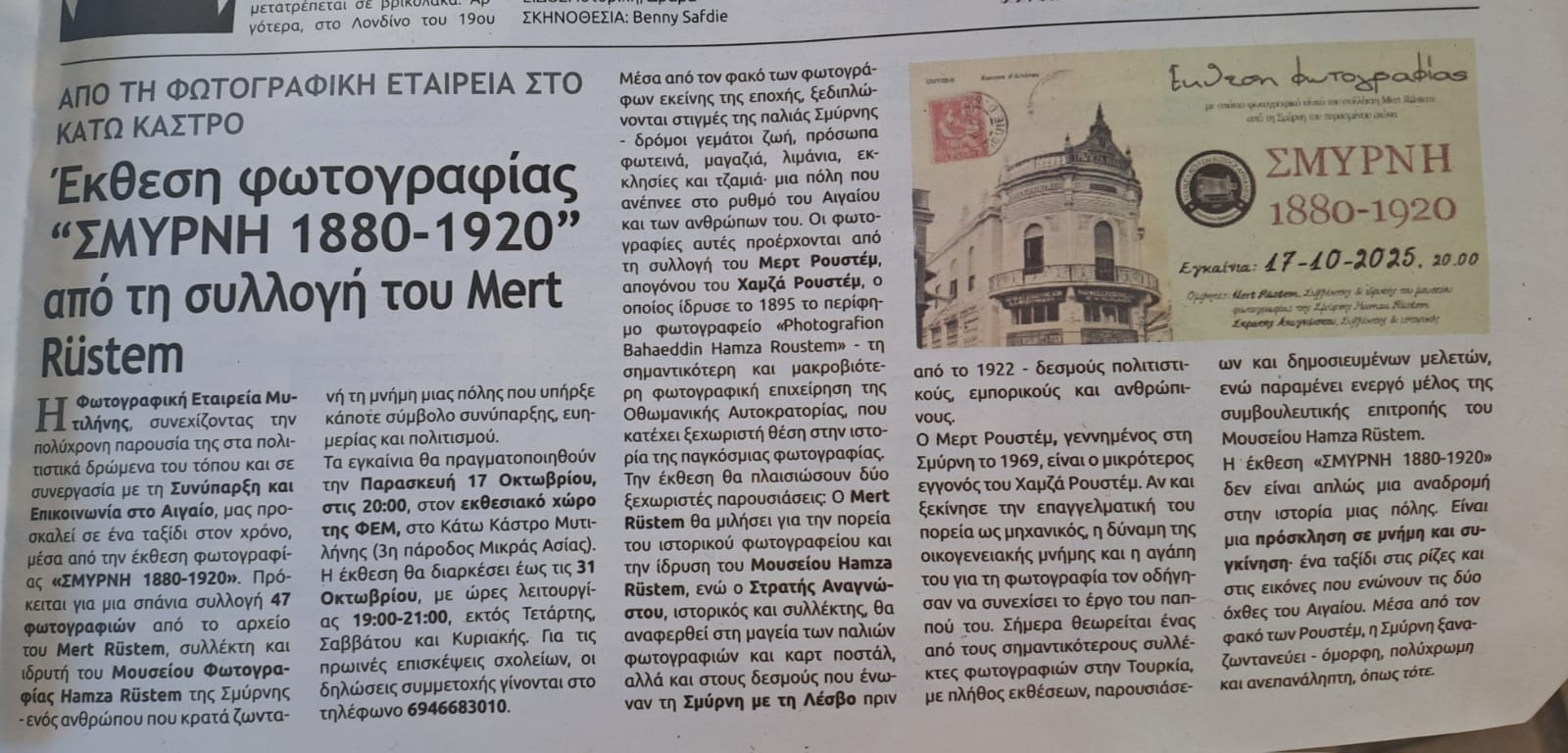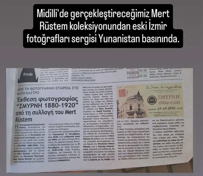 Mert Rüstem’den Girit’te “İzmir” Fotoğraf Sergisiİzmirli fotoğrafçı ve koleksiyoner Mert Rüstem, Yunanistan’ın Girit Adası’nda “İzmir 1860–1920” temalı bir fotoğraf sergisi açtı. Ada halkının yoğun ilgi gösterdiği sergi, Türk-Yunan dostluğuna sanatsal bir katkı sundu.