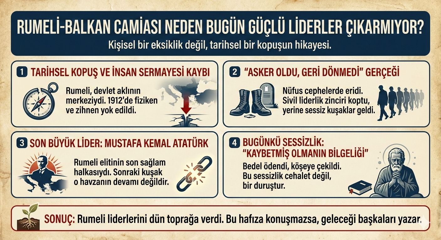 RUMELİ-BALKAN CAMİASI NEDEN BUGÜN GÜÇLÜ LİDERLER ÇIKARMIYOR? Bu soru kişisel eksiklikle değil, tarihsel kopuşla açıklanabilir. Rumeli ve Balkan coğrafyası, Osmanlı’nın yalnızca sınır hattı değil; devlet aklının, askerî kadronun ve bürokratik elitin ana üretim merkezlerinden biriydi. Ancak bu merkez bilinçli ya da bilinçsiz şekilde tüketildi.